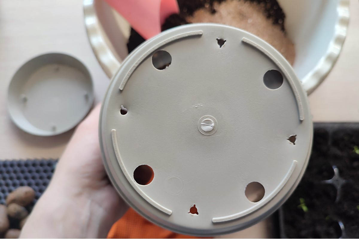 Обязательно проверьте дренажные отверстия на дне. Иногда их закрывают тонким слоем пластика — уберите его. Так вода не будет застаиваться.