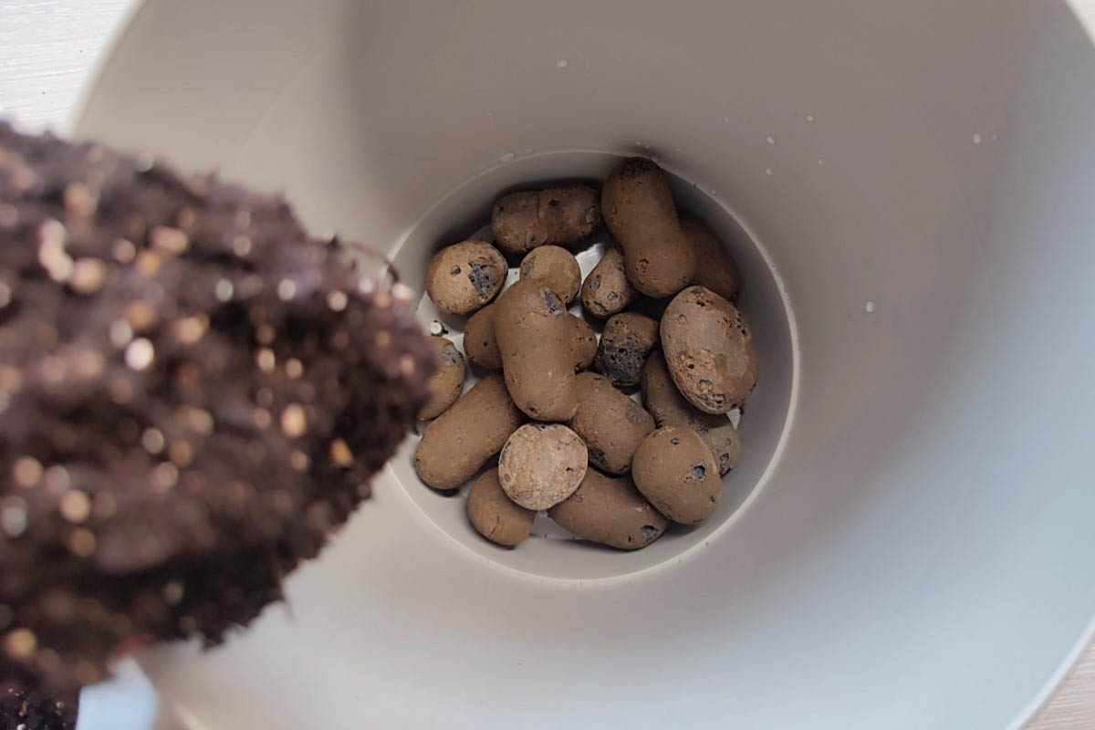 Дренажный слой на дне горшка обязателен. Он отводит лишнюю воду и защищает корни от гнили. Используйте керамзит, мелкую гальку или перлит. Толщина слоя — 2-3 сантиметра.