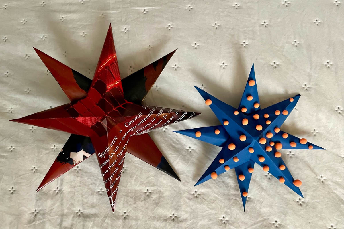 Я сделала две совершенно разные звезды. Выберите форму и сделайте несколько разного размера — их можно повесить на окно или над дверью.