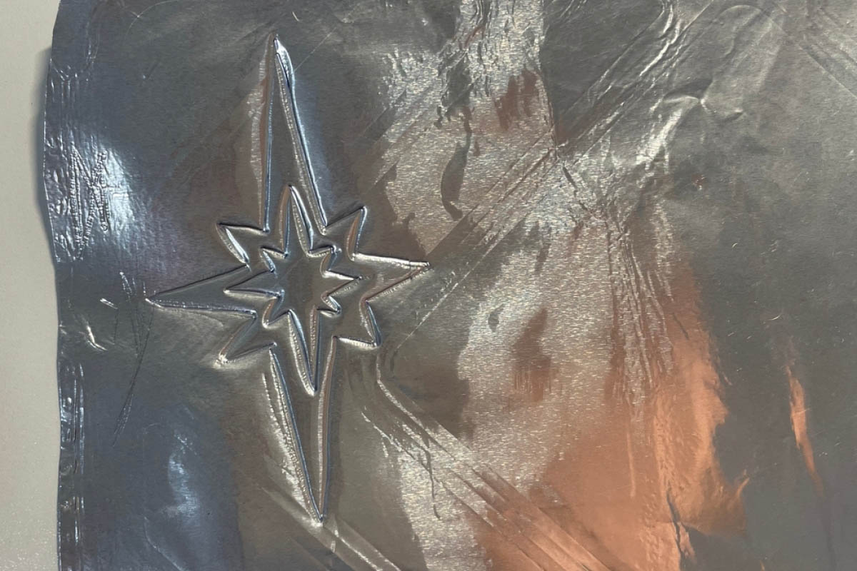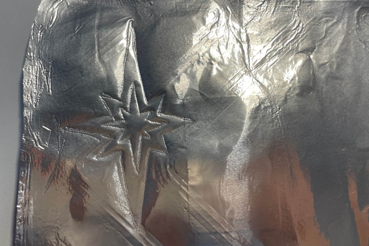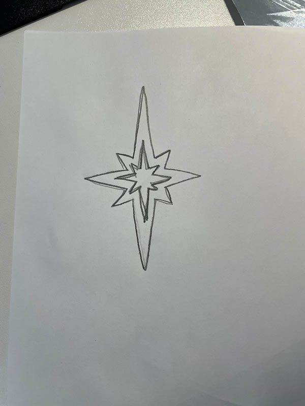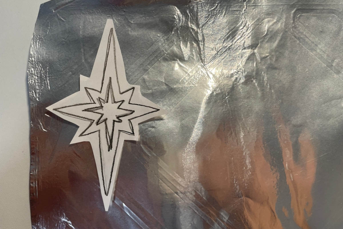 Затем найдите подходящее изображение или нарисуйте его сами. Я нарисовала звезду — это будет трафарет. Приложите лист к фольге и обведите границы ручкой. После этого уберите бумагу и продавливайте углубления на фольге по контуру — через бумагу получается нечетко.