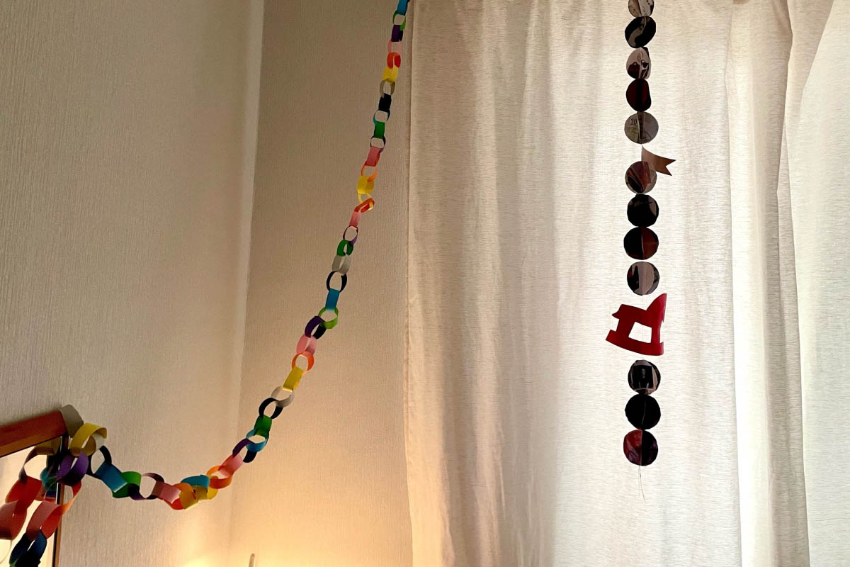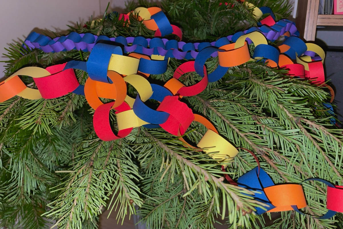 Проще украшения, наверное, не придумаешь — гирлянды из бумажных колец делали в детстве. Все, что нужно, — это разноцветная бумага, ножницы и клей (или степлер).