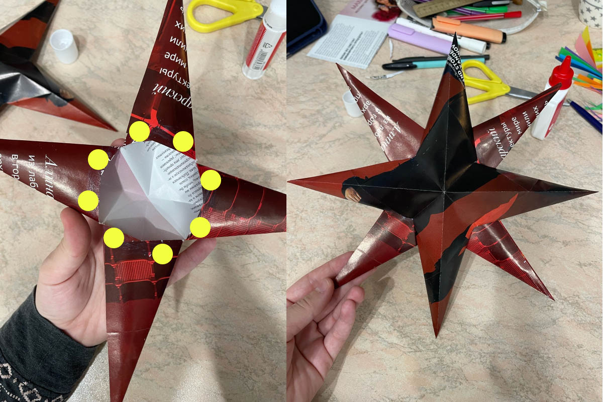 Склейте две половинки звезды между собой и аккуратно прижмите. Дайте клею немного подсохнуть (ПВА схватывает бумагу надежнее, чем клей-карандаш).