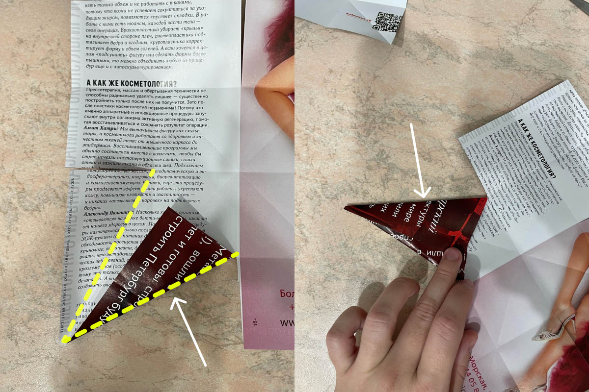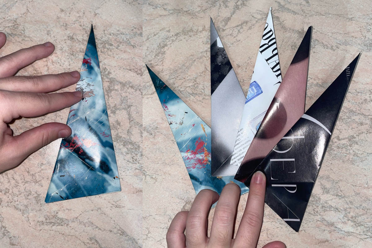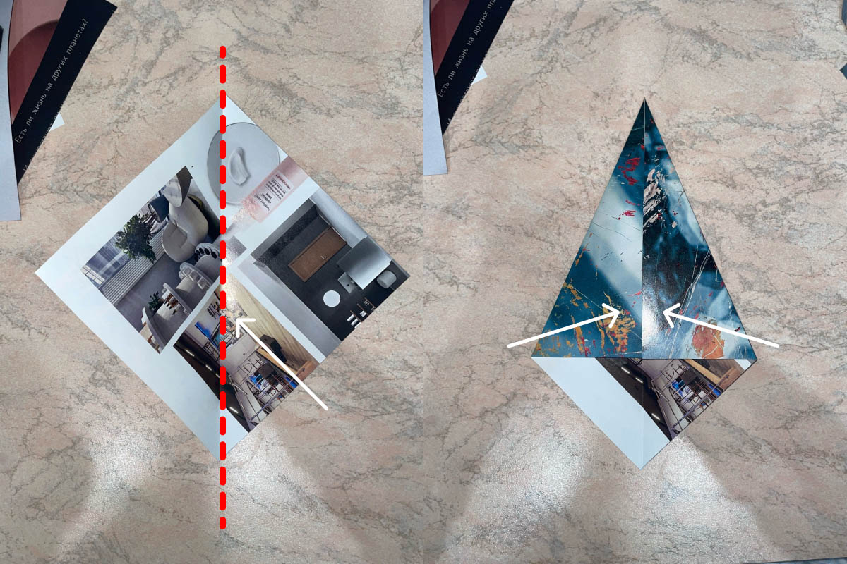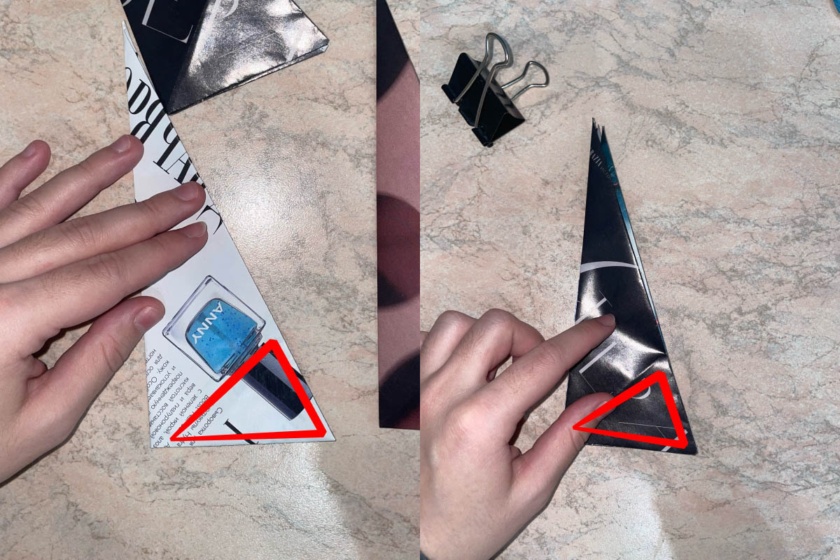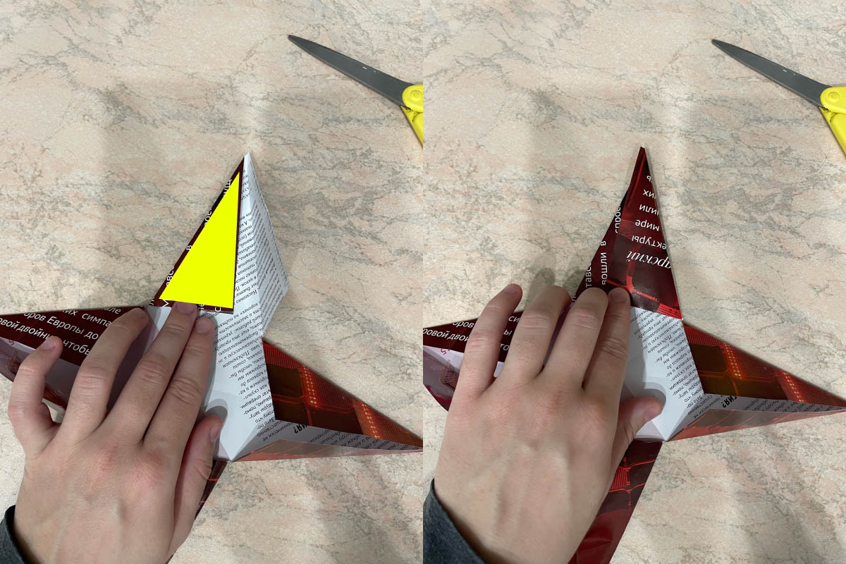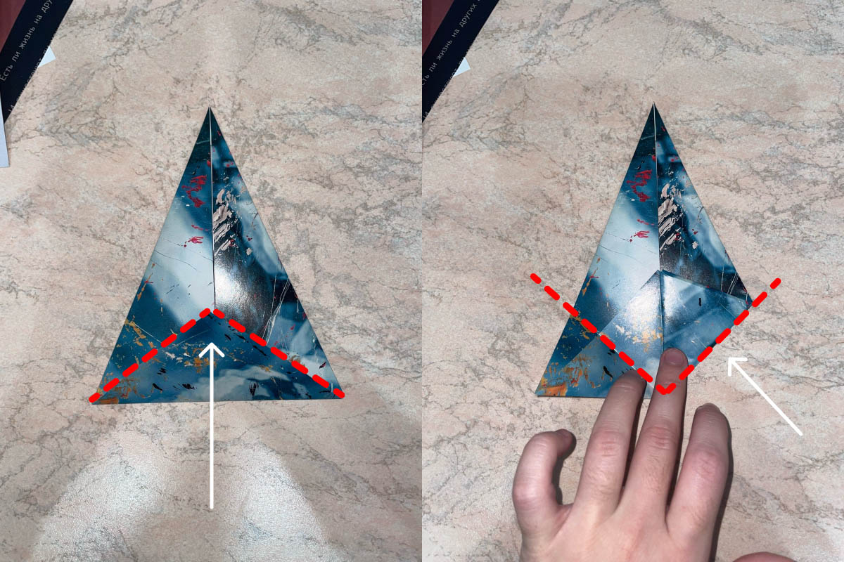 Согните получившиеся треугольники по диагональным линиям, формируя объем. Склейте их, чтобы зафиксировать форму. Повторите все шаги со вторым листом бумаги.