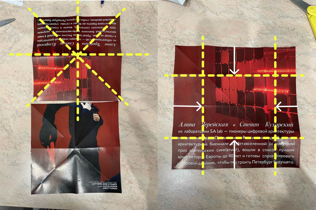 Сложите лист с каждой стороны к середине — по этим линиям сгиба нужно сделать надрезы.