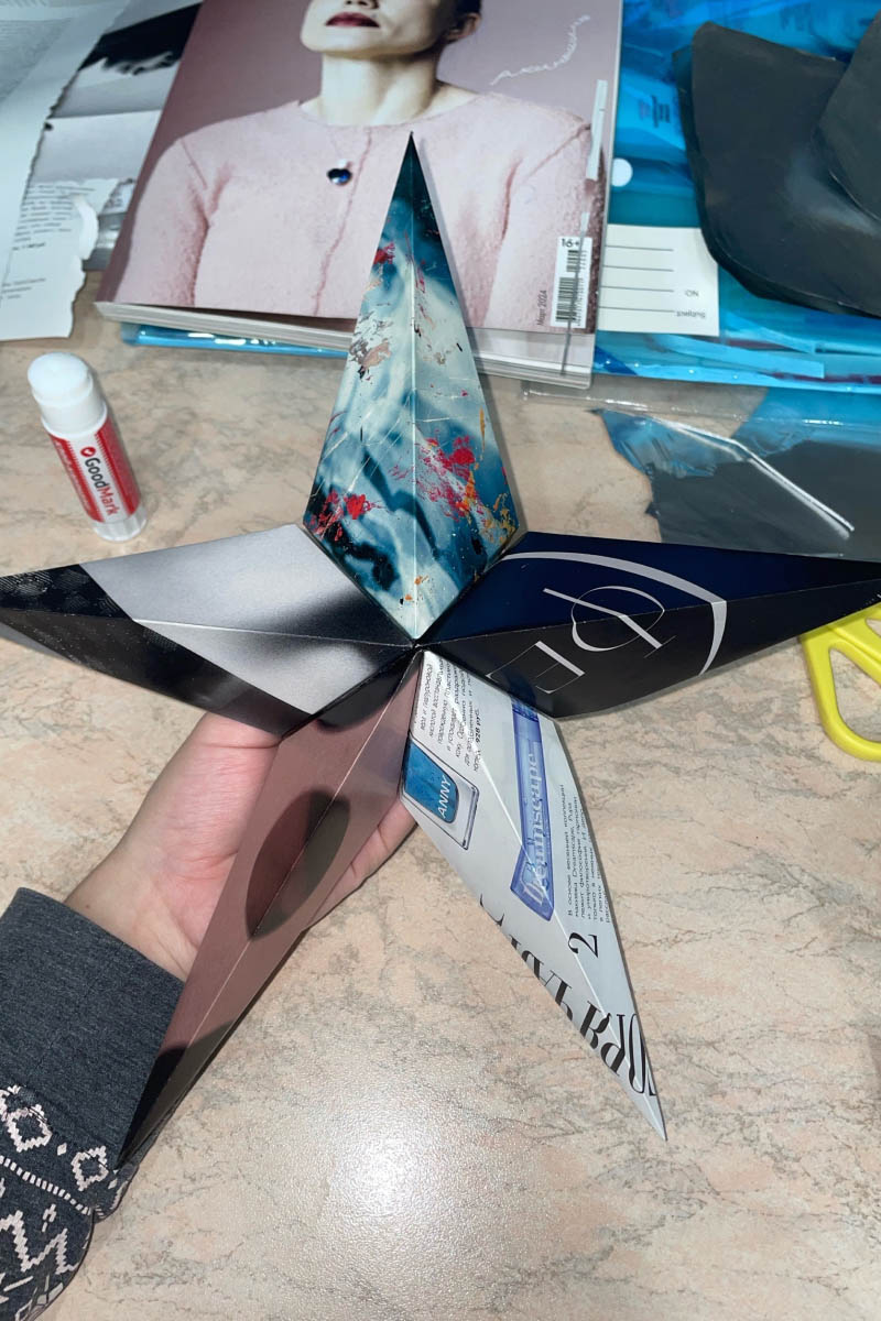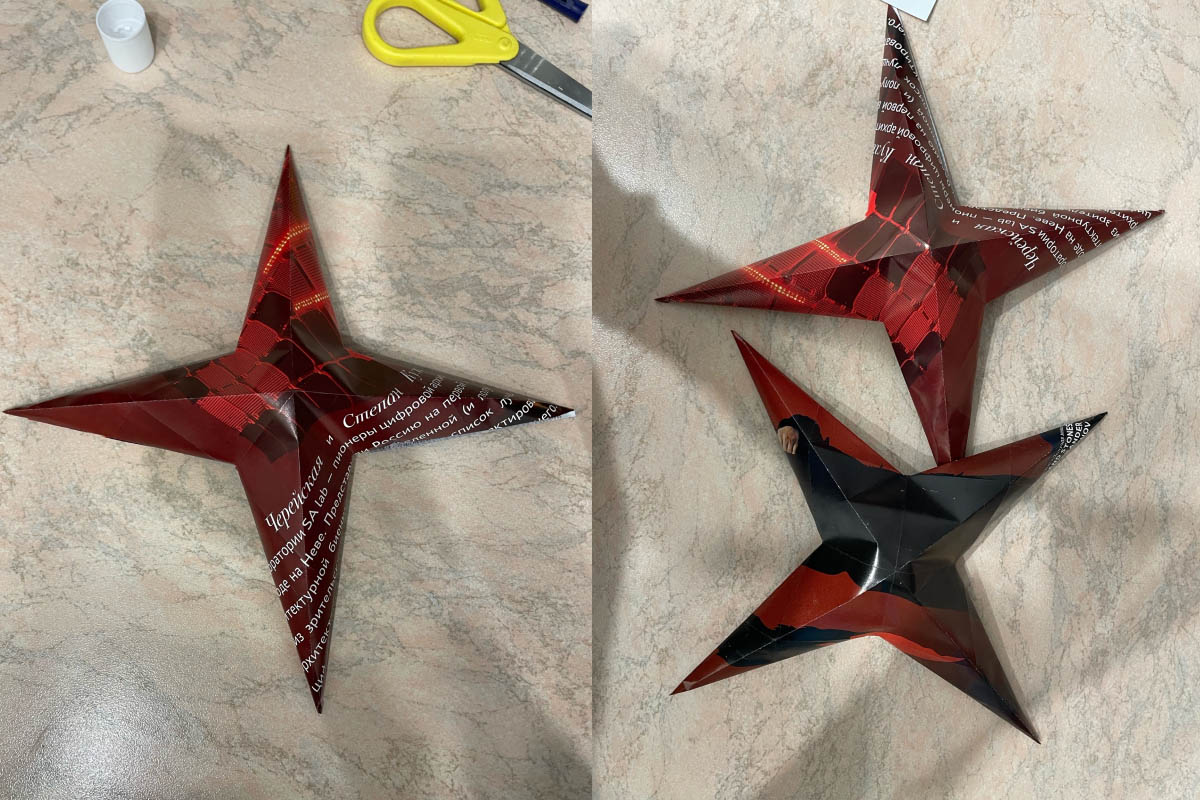 Такую звезду удобно вешать на стену или другую плоскую поверхность.