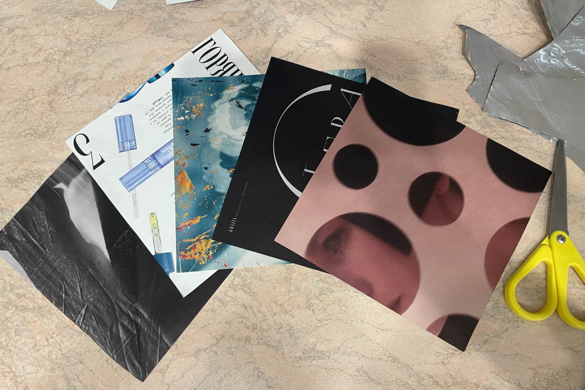 Мне не хотелось делать из цветной бумаги, поэтому я взяла журналы и нашла страницы, которые мне нравятся и сочетаются между собой.
