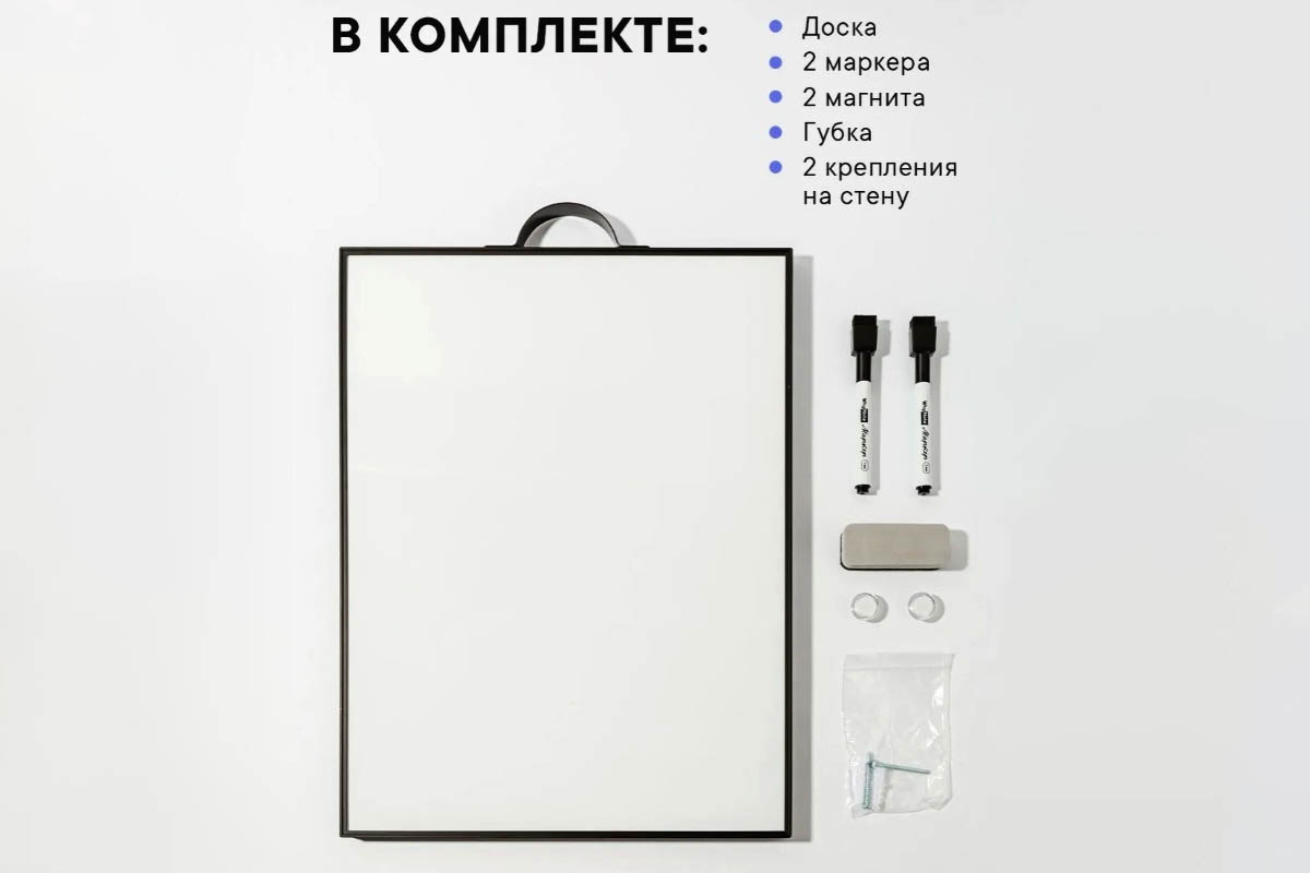 Доска может быть любой — меловой, пробковой, магнитной. Чаще выбирают магнитную: на ней можно рисовать маркером и быстро стирать написанное.