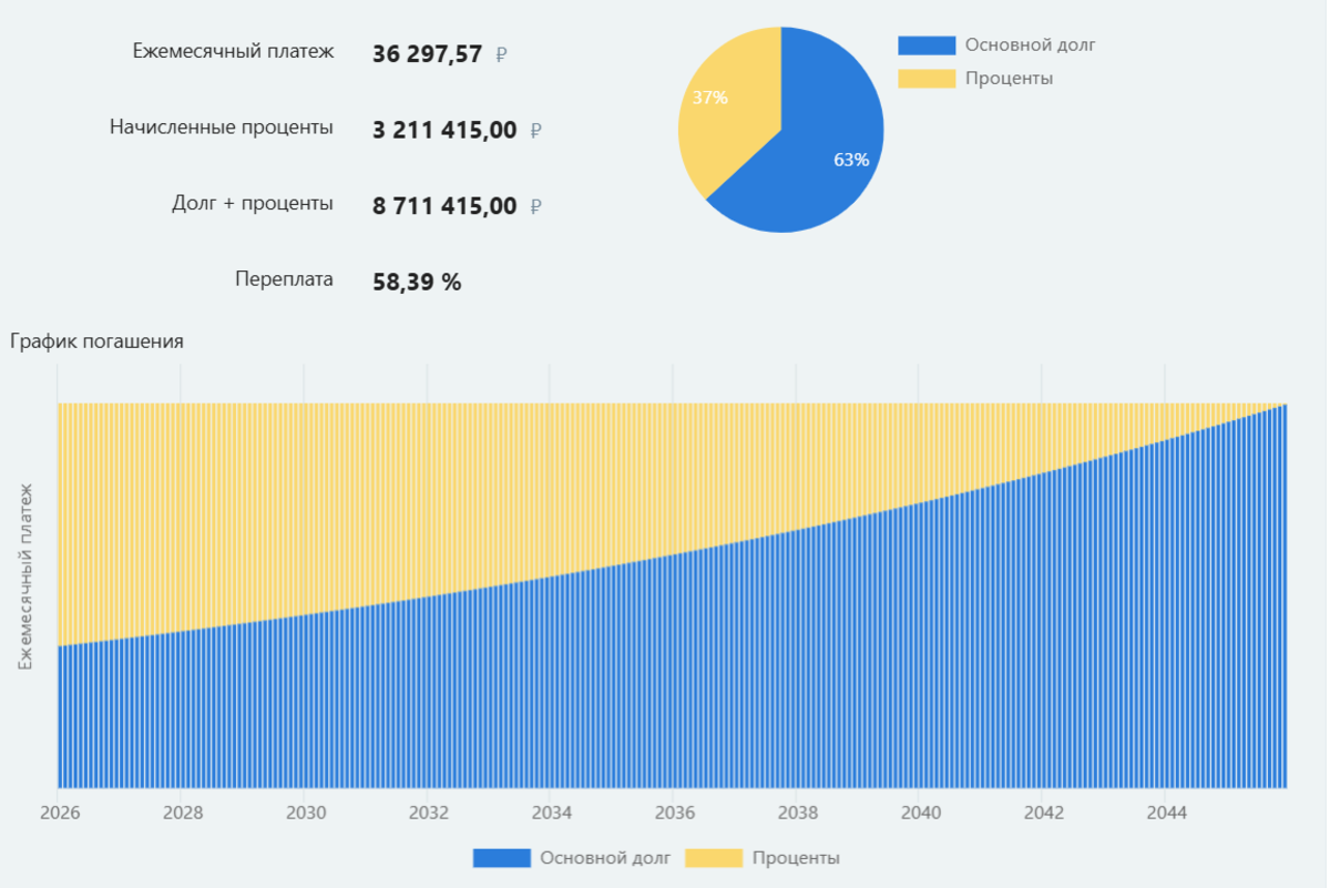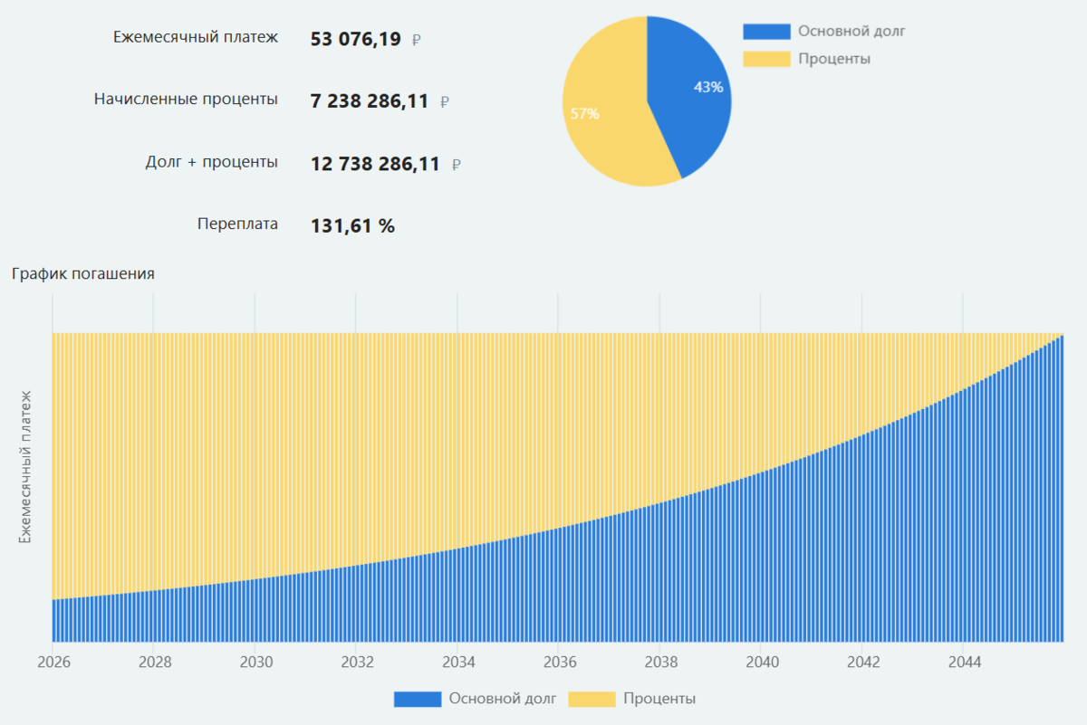 Если брать на 20 лет под 5%, то платеж меньше 40 тысяч, а переплата банку — 3,2 млн, 37% от общей суммы выплат. Источник: calcus.ru