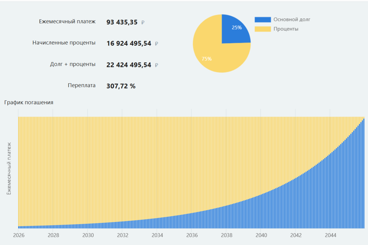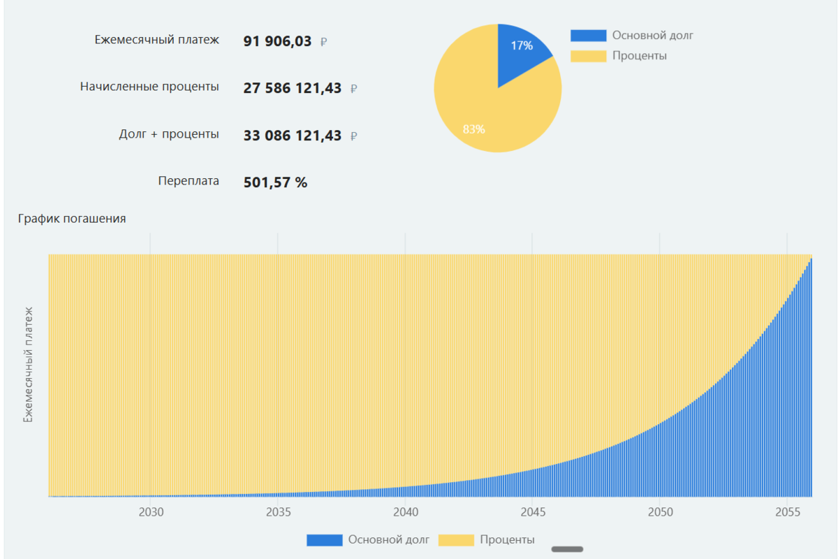 В итоге получается, что даже если у вас есть 1,5 млн на первоначальный взнос, придется вносить около 100 тысяч в месяц за ипотеку и за 20 лет переплатить стоимость еще такой же квартиры.