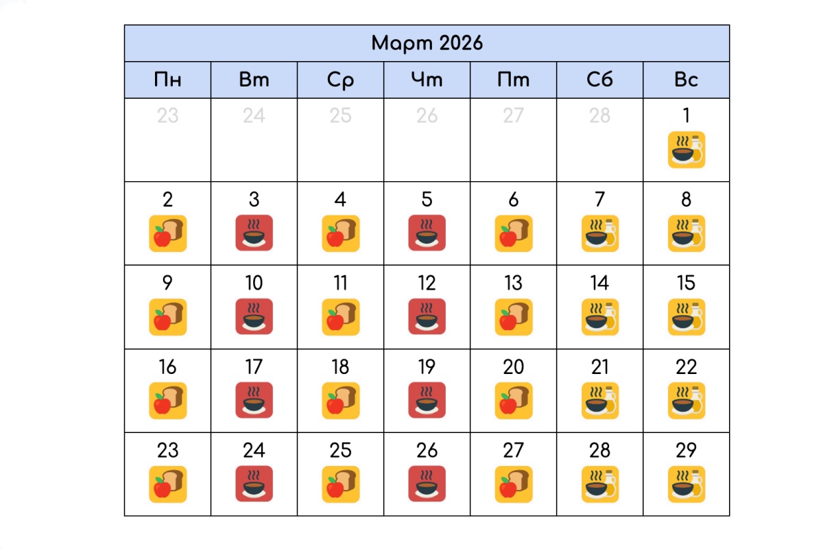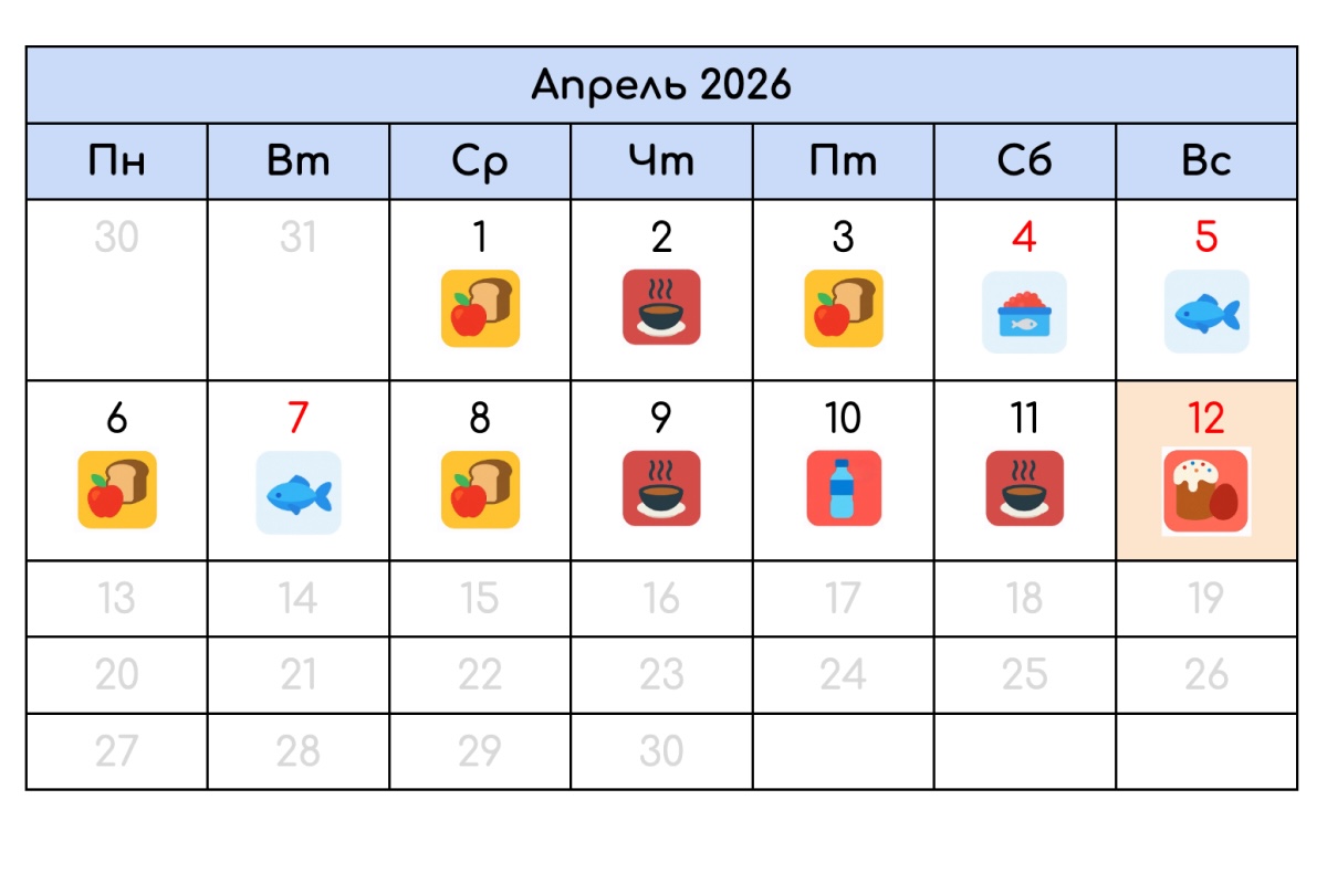 Все семь недель верующие не едят мясо, молочные продукты и яйца. В одни дни рацион строже, в другие — мягче: например, в праздники разрешена рыба. Чтобы не забыть, какая пища дозволена, сохраните календарь Великого поста на 2026 год, постное меню на неделю и рецепты на каждый день.