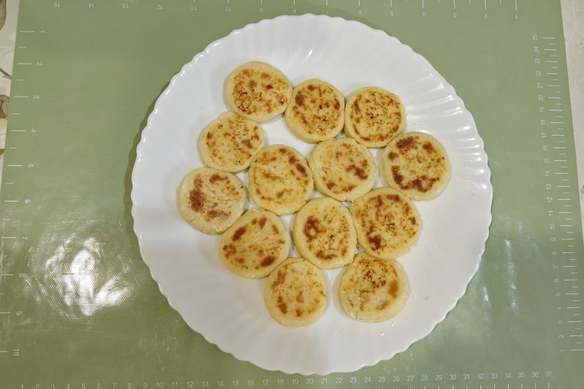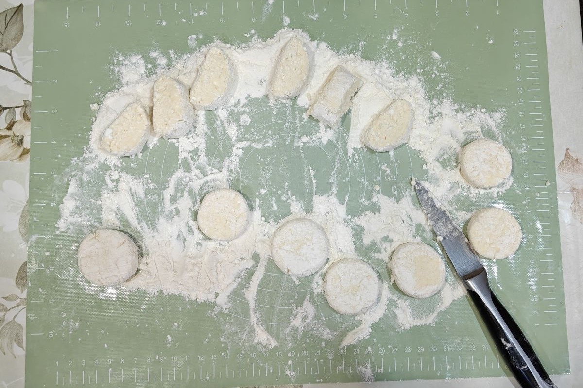 - Из каждого «пятачка» широким ножом сформируйте сырничек: чуть приплюсните сверху, а потом покрутите его между широкой стороной лезвия и пальцами, скругляя бока.