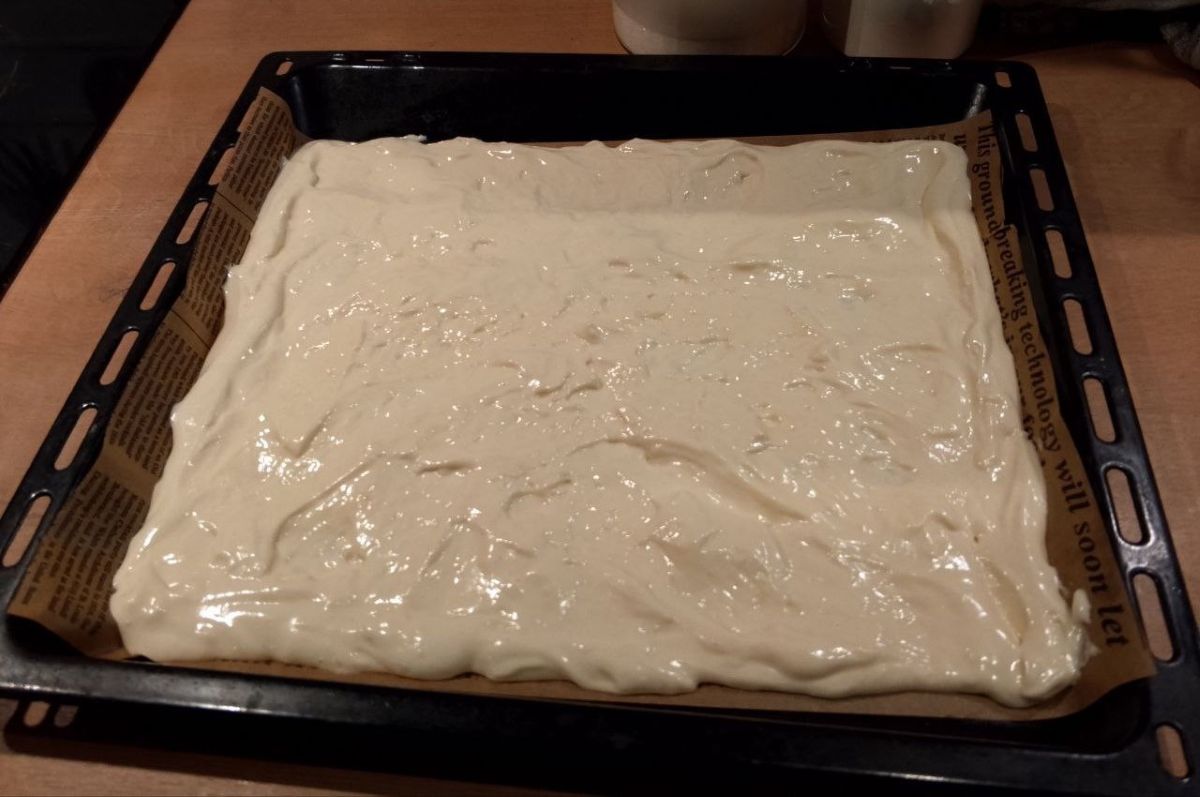 - Добавьте яйцо, муку, сыр и йогурт, замешайте тесто. Выложите его на противень на пергамент в форме блина.