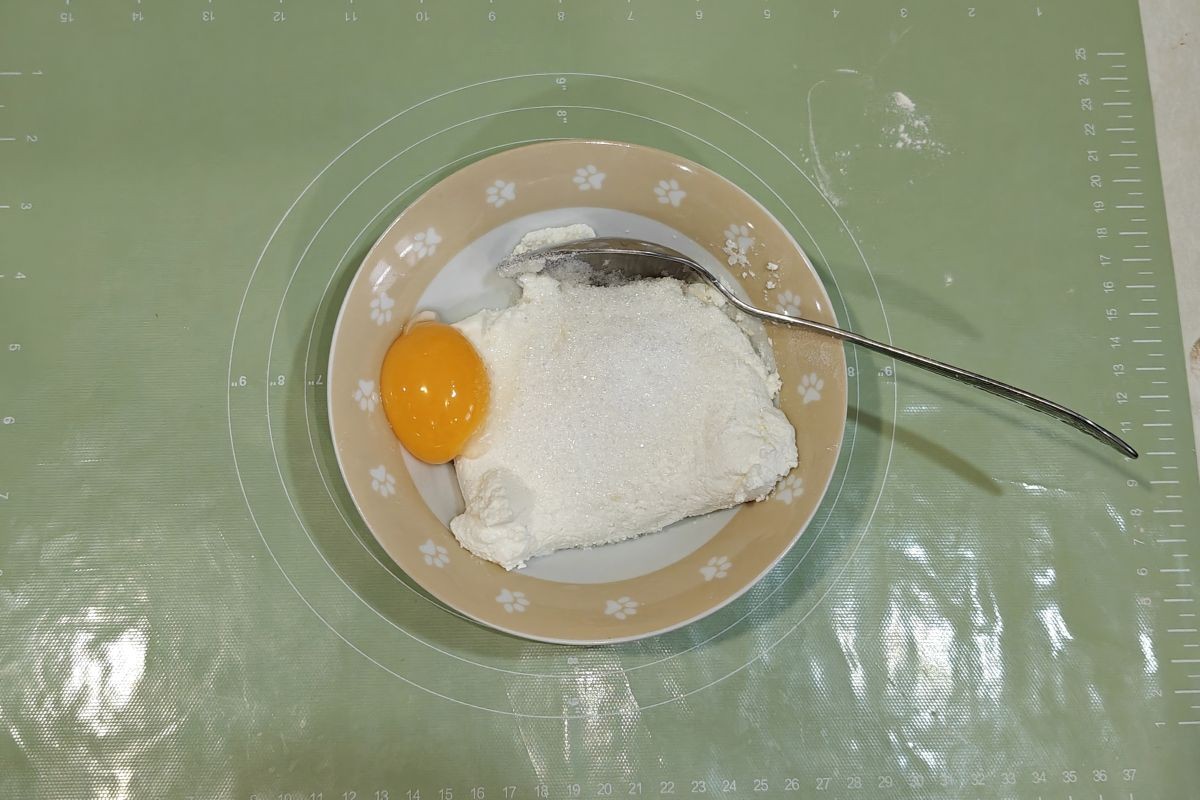 - К творогу добавьте щепотку соли, две столовые ложки сахара и желток. Тщательно перемешайте.