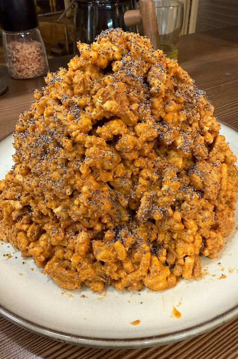 Если кратко: нужно сделать песочное тесто, заморозить его, потом пропустить через мясорубку, запечь, поломать на не слишком мелкие кусочки, замешать в креме из сгущенки и сливочного масла. Потом сформировать тортик, посыпать маком. Можно еще добавить жареный арахис, но это не обязательно.