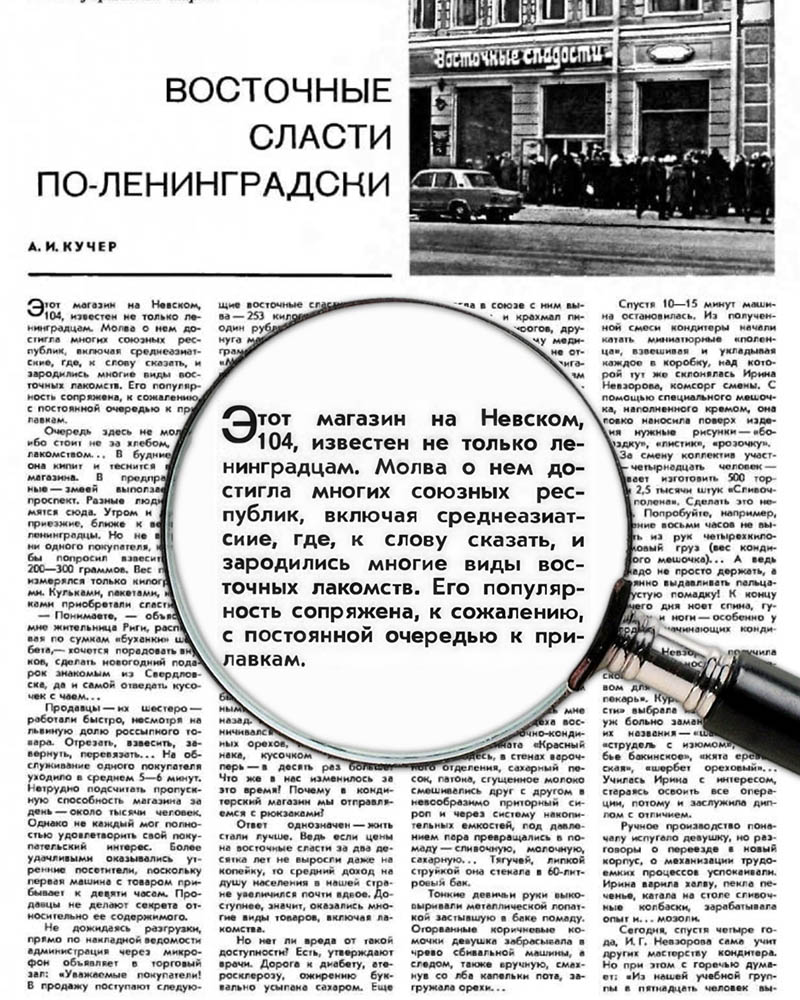 В середине прошлого века на Невском, 104 выстраивались длинные очереди. Сюда приезжали с разных концов Ленинграда. В очередях были даже туристы из других городов и стран. Люди стояли часами ради ароматного рахат-лукума, тающей во рту пахлавы, ореховых трубочек и других «восточных сластей» — именно так в народе называли десерты.