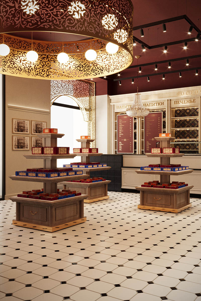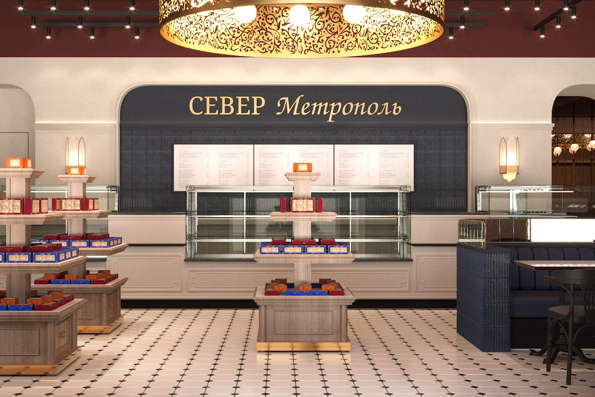 Ажурные люстры, расписные стены и витрины с фирменными коробочками. Источник: «Север-Метрополь»