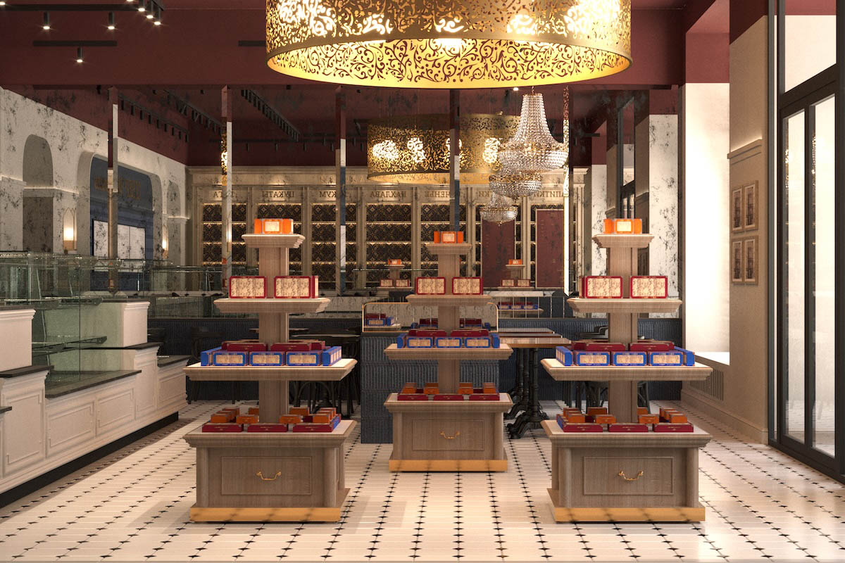 Фирменный орнамент «Север-Метрополь × Восточные Сладости», нарисованный вручную, виден везде: он оживает в рисунке оконных арок, заметных с проспекта, отражается в свете люстр, росписи стен. Конечно, узор есть и на упаковке.