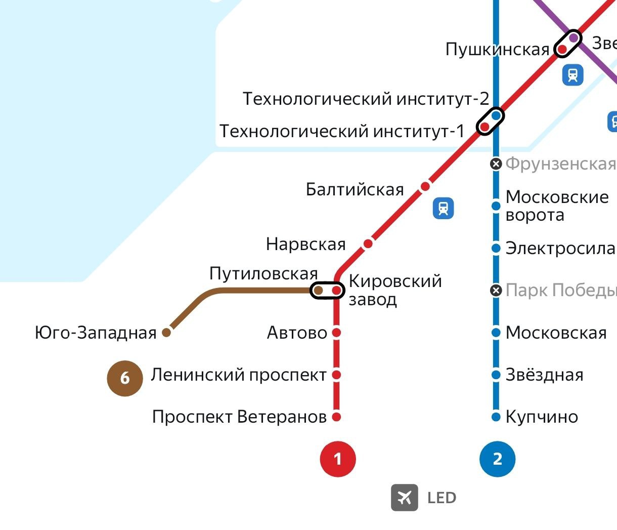 Это станции шестой, «коричневой» ветки метро. Пока их две. «Путиловская» — это пересадочный узел с новой ветки на станцию «Кировский завод» (это старейшая «красная» ветка). «Юго-Западная» — первая станция в Красносельском районе Петербурга.