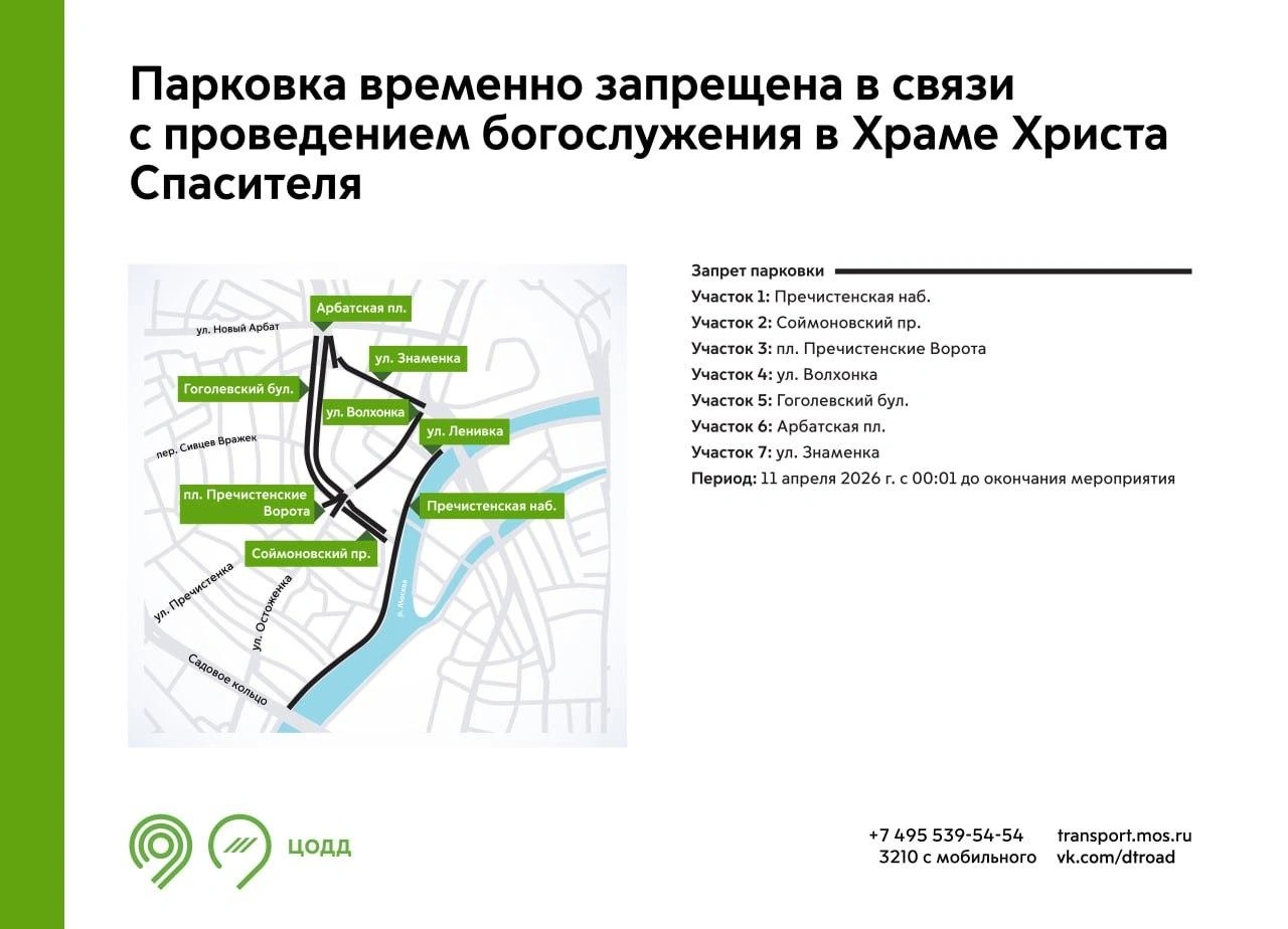 С 00:01 11 апреля и до конца богослужения нельзя будет оставить машину у Храма Христа Спасителя. Кроме того, парковка будет недоступна: