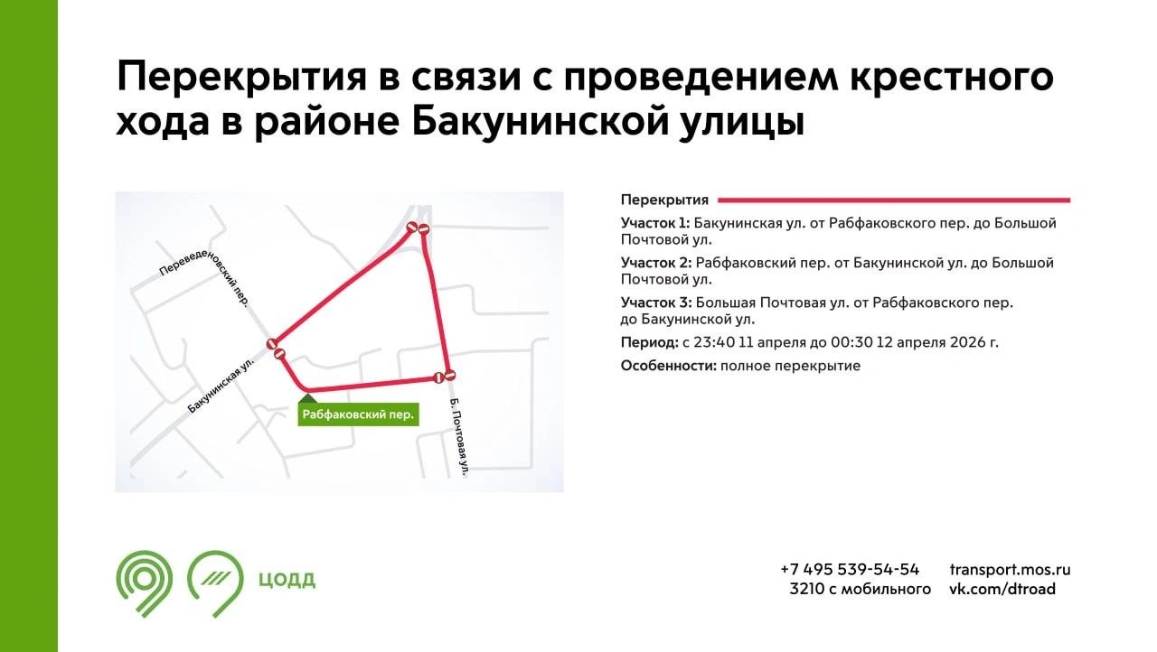 - 11 апреля с 23:40 до 00:30 12 апреля движение остановят в Рабфаковском переулке, а также на отдельных отрезках Бакунинской и Большой Почтовой улиц.