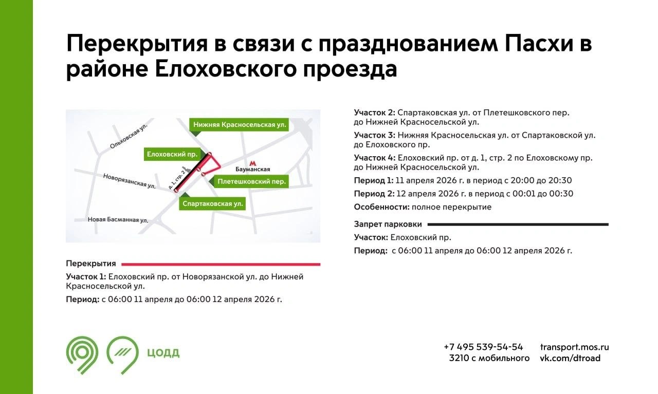 - С 06:00 11 апреля до 06:00 12 апреля полностью перекроют Елоховский проезд. Там же на это время запретят парковку.