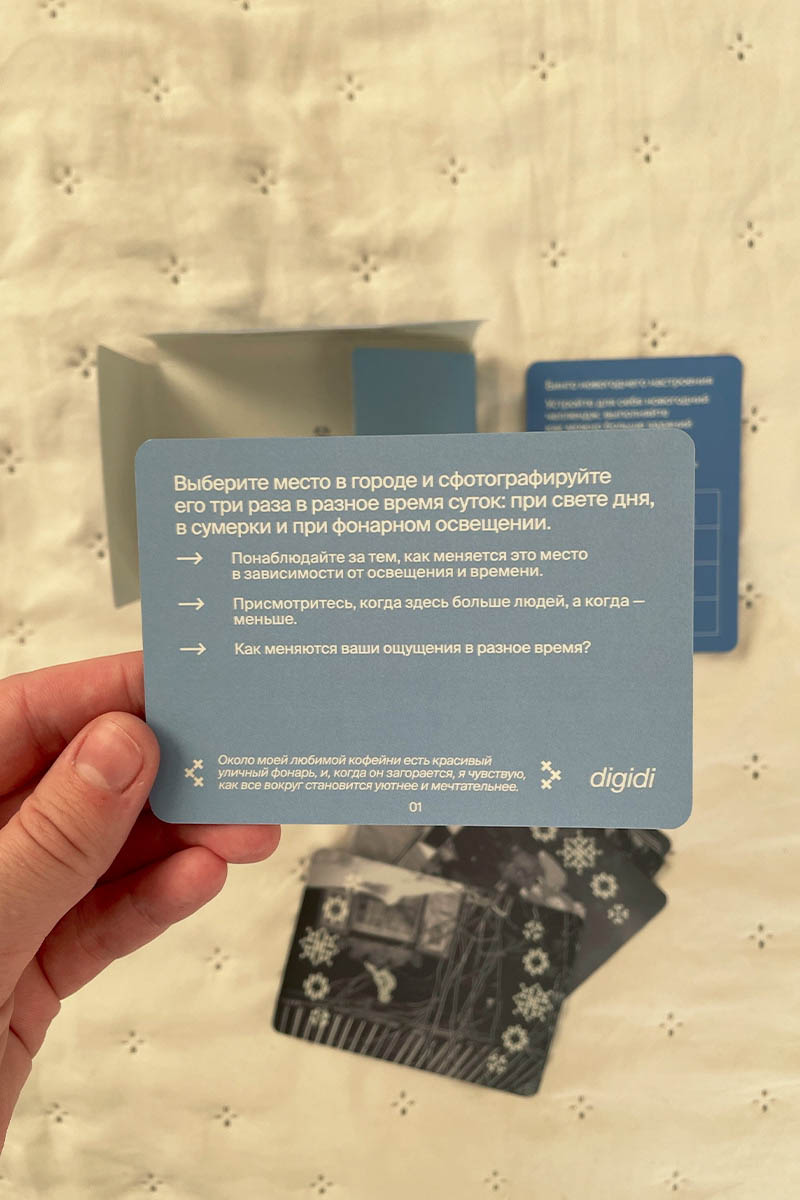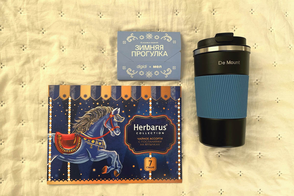Другой подруге, Полине, собрала тематический подарок: игру «Зимние прогулки» (по предзаказу и промокоду на первый заказ 1285 ₽), термокружку (530 ₽) и чай (119 ₽). Она очень любит гулять и фотографировать.