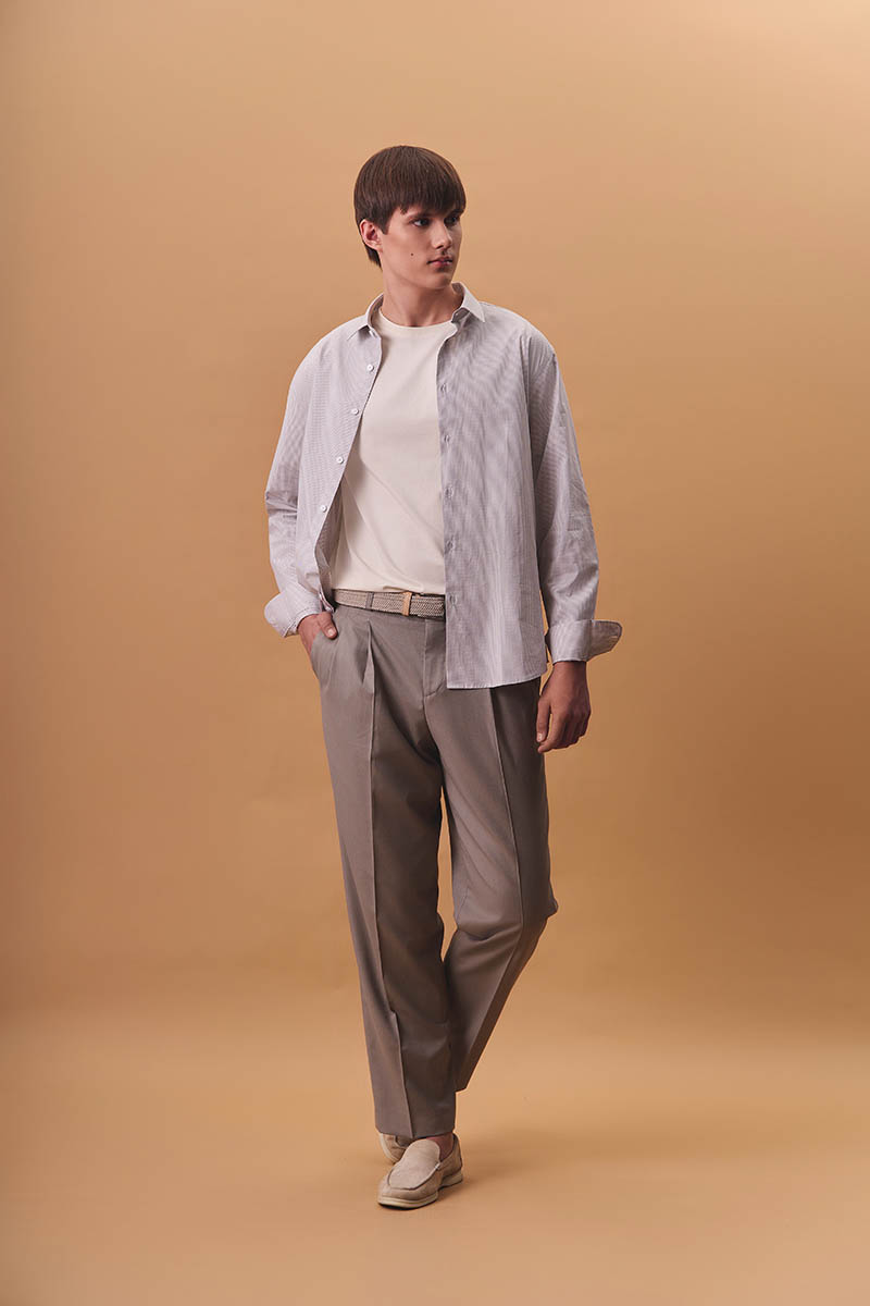 Добавьте объема фигуре за счет многослойности: белая футболка плюс рубашка сверху. Заправьте второй слой в брюки и слегка выпустите, чтобы он немного прикрывал ремень. Застегните пуговицы до середины.