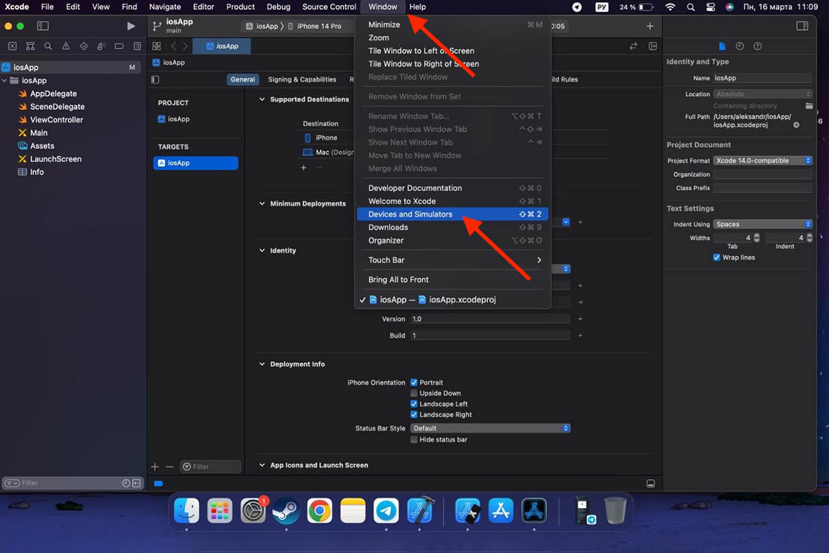 - Найдите в меню Window опцию Devices and Simulators («Устройства и симуляторы»).